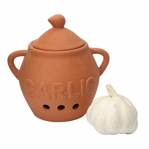 This storage jar for garlic has ventilation holes for keeping garlic at room temperature and reduces humidity and light that prevents germination and sprouting.