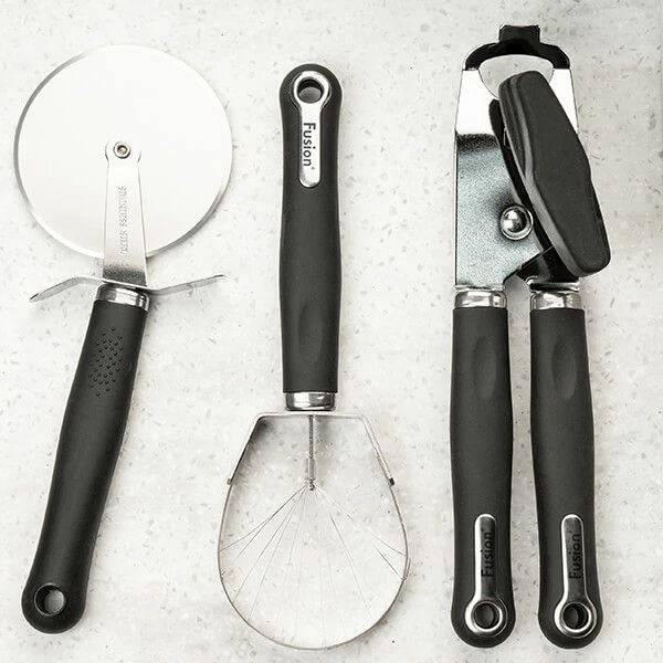 The Fusion can opener is designed in a traditional style for manually opening can of food at home.