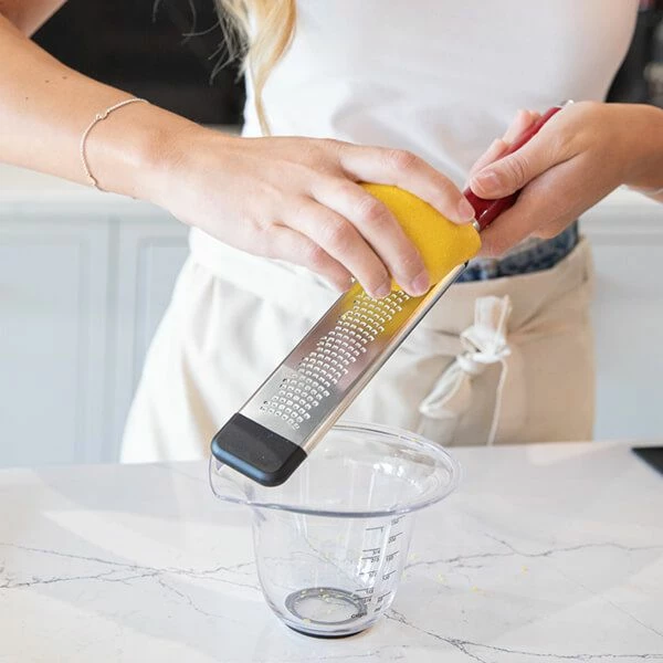 Crafted from premium grade materials, this KitchenAid Stainless Steel Two-Way Fine Cheese Grater in Empire Red is ideal for grating hard cheeses, chocolate, nutmeg and ginger as well as zesting lemons, limes and other citrus fruit. The extra sharp stainless steel blade features unique micro-serrations that grate in two directions for greater speed and efficiency. The addition of a silicone foot means this fine grater can be used in a number of ways – grating directly into a bowl, on a cutting board or onto any flat surface. The glossy ergonomic handle provides a sure grip and features a satin chrome-plated bolster and a debossed logo.