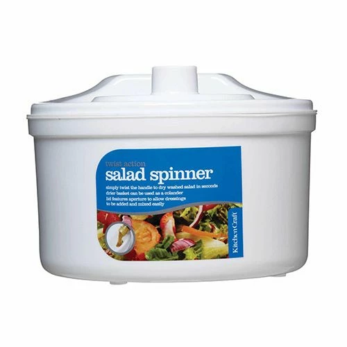 Twist action salad spinner with enclosed drying basket, for quick and easy drying preparation of washed salad. Features an aperture for adding salad dressing whilst spinning to evenly coat throughout the salad ready for serving.