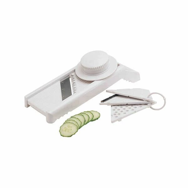 Create seven different types of cutting within one slicer, the multi-purpose plastic mandoline and grater is perfect for a variety of different slicing tasks. Includes four stainless steel blades for producing coarse and fine grating, shredding, chipping and slicing cooked meats and vegetables, as well as a safety guard for safe, easy use.
