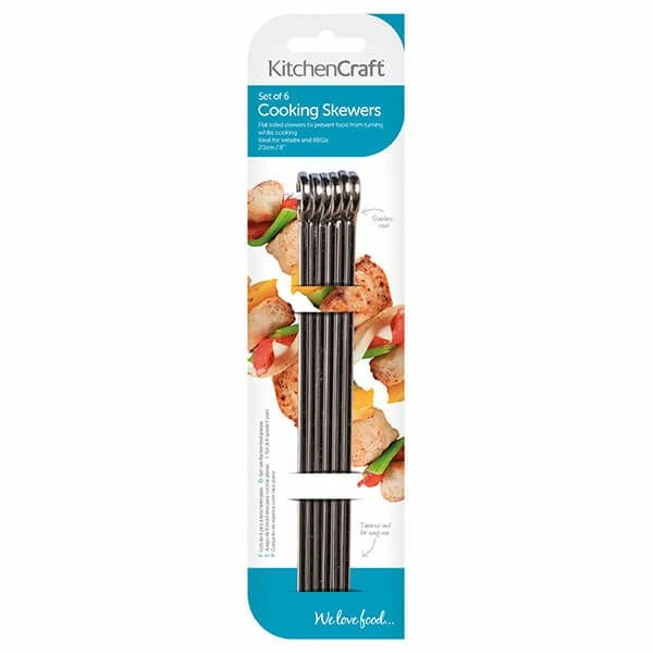 KitchenCraft Pack of Six 20cm Flat Sided Skewers are reusable metal cooking skewers ideal for cooking a variety of different types of kebabs and party food. Features a flat side to prevent food from turning whilst cooking and a lifting ring at the end for easy handling. 12 month guarantee. Size: 20cm.