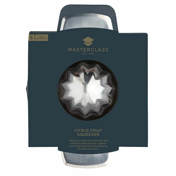 The MasterClass Stainless Steel Citrus Fruit Squeezer can be used with any type of citrus fruit. This squeezer features a domed, perforated insert for squeezing the juice and extracting pulp and pips and a lipped, as well as a wide handled base for easy pouring of the juice when extracted. Dishwasher safe. 5 year guarantee.
