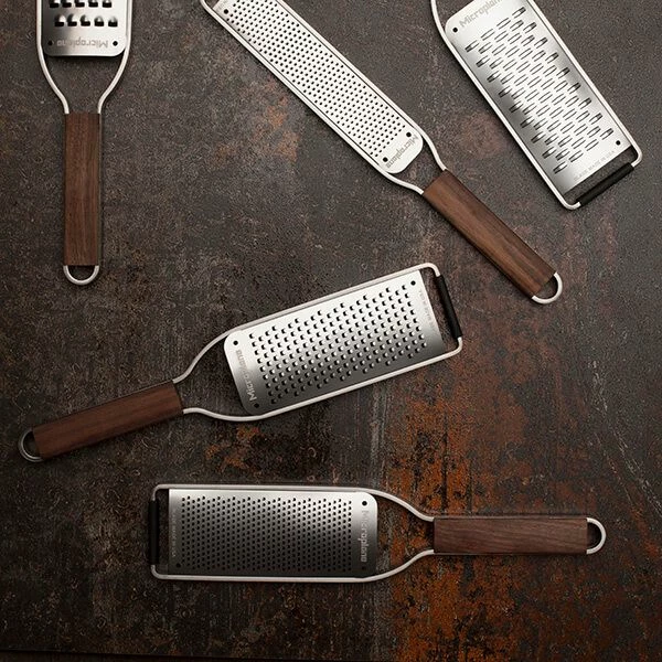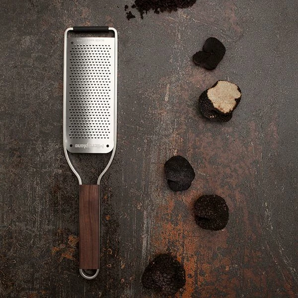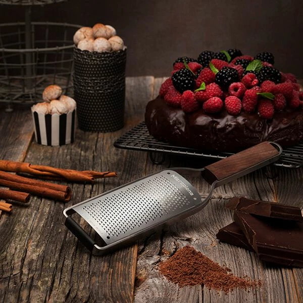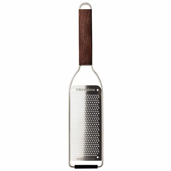 The Microplane Master Series Fine Grater features an ultra sharp and long lasting stainless steel blade with a stunning wooden handle sourced from sustainable American Walnut that provides comfort and grip.